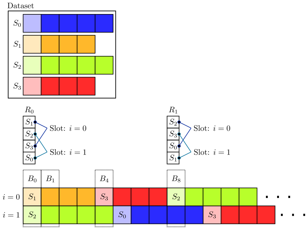 The sampling is performed by assigning for each “sample index slot” \(i\) a set of sequences and then iterating through the sequences and outputting one sample at a time at the position \(i\). For this, the sequences are shuffled (represented by \(R_c\) in the illustration) whenever a new cycle \(c\) is started for one of the slots (\(R_0\) and \(R_1\) in the illustration correspond to the first two cycles).
