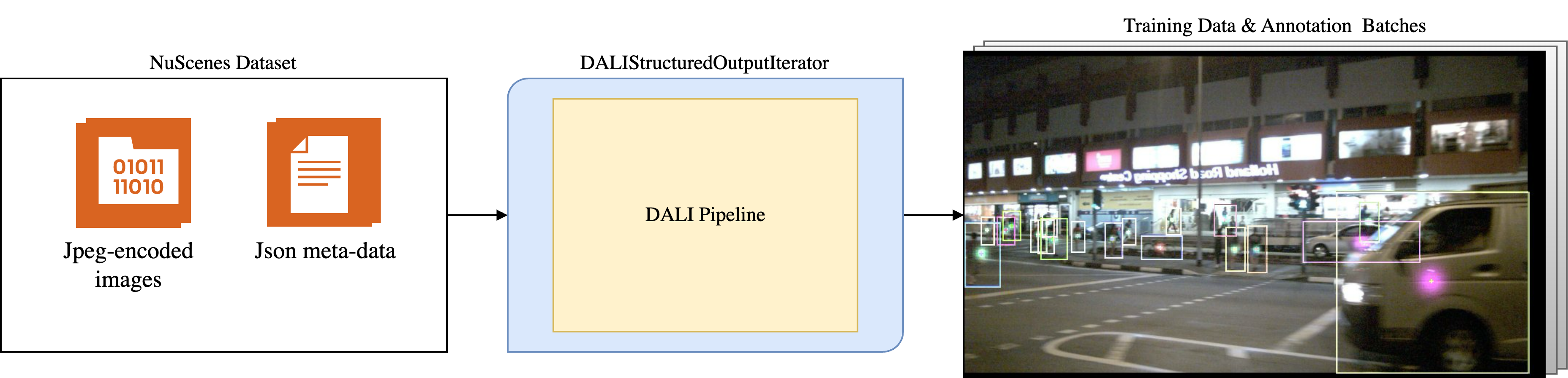 SampleDataGroupclass in combination with theDALIStructuredOutputIteratorwrapper for the pipeline, we can provide a structured output in the exact same format that a typical PyTorch DataLoader would provide (i.e. a nested dictionary), so that the DALI pipeline can be used as a drop-in replacement, without the need to change the training implementation (except for the construction of the pipeline instead of a PyTorch DataLoader). Note that while this may be possible with the PyTorch DALI proxy, it is not supported out-of-the-box for pure DALI pipelines.Enforce a well-defined data format (as a