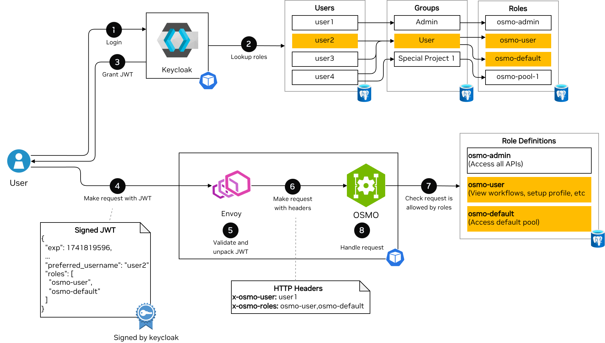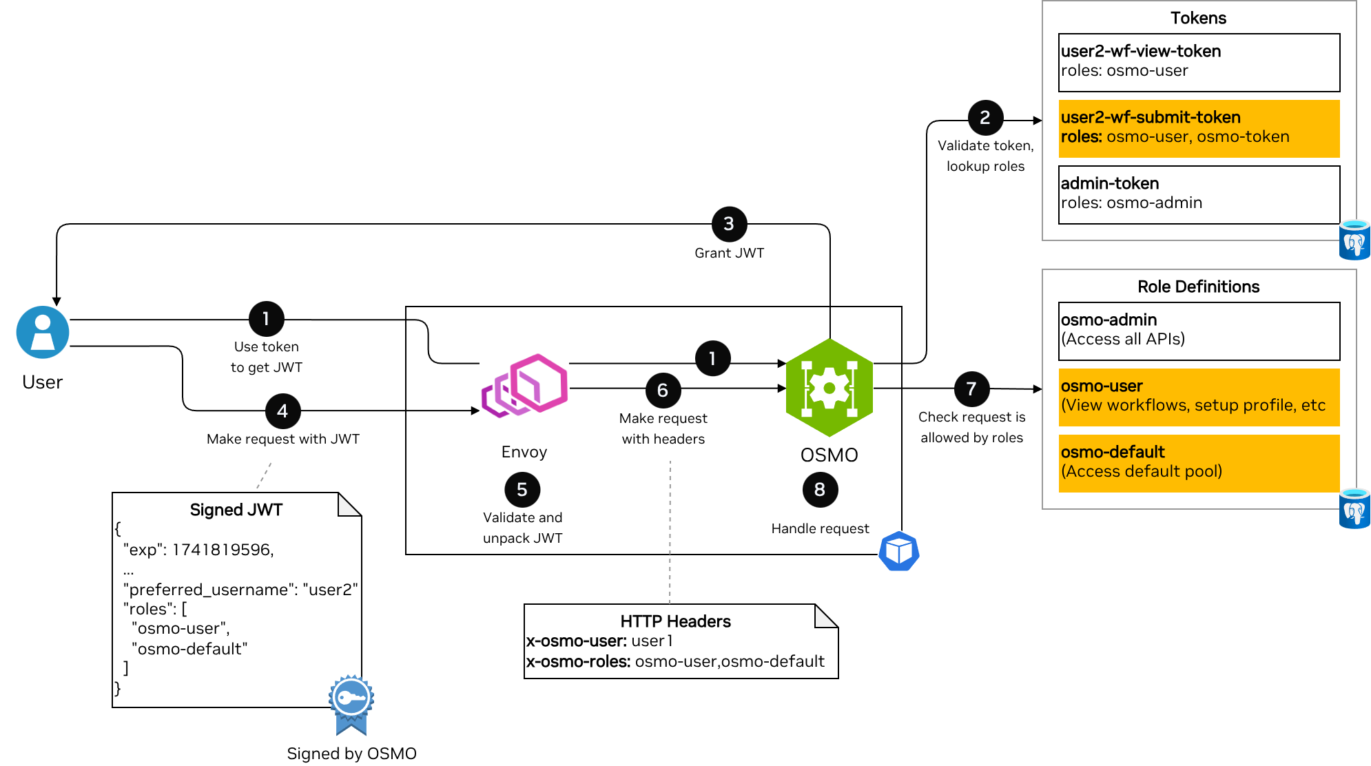 preferred_usernameclaim) and roles (in therolesclaim).Make request with JWT: The user makes a request to OSMO using the JWT token in the