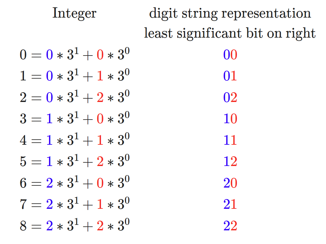 A two qudit system, \(n=2\), with three levels, \(d=3\), has \(d^n=8\) computational basis states: \(\ket{00}, \ket{01}, \ket{02}, \ket{10}, \ket{11}, \ket{12}, \ket{20}, \ket{21}, \ket{22}\).