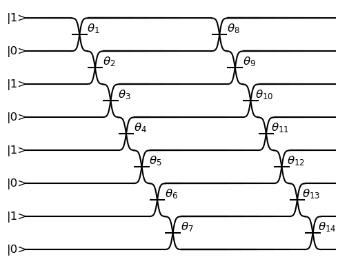ORCA Computing’s PT Series implement the boson sampling model of quantum computation, in which multiple single photons are interfered with each other within a network of beam splitters, and photon detectors measure where the photons leave this network. This process is implemented within a time-bin interferometer (TBI) architecture where photons are created in different time-bins and interfered within a network of delay lines. This can be represented by a circuit diagram, like the one below, where this illustration example corresponds to 4 photons in 8 modes sent into alternating time-bins in a circuit composed of two delay lines in series.