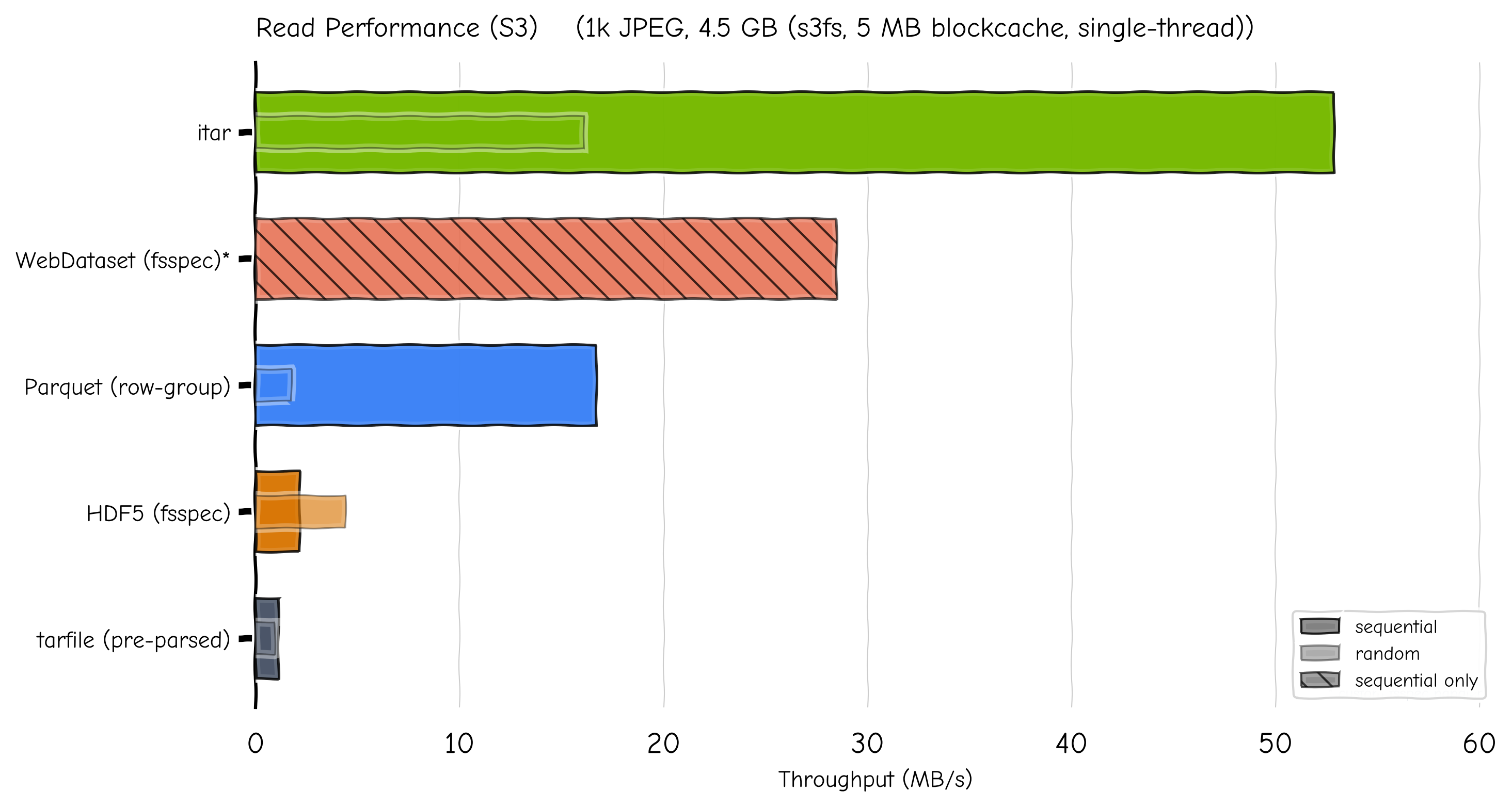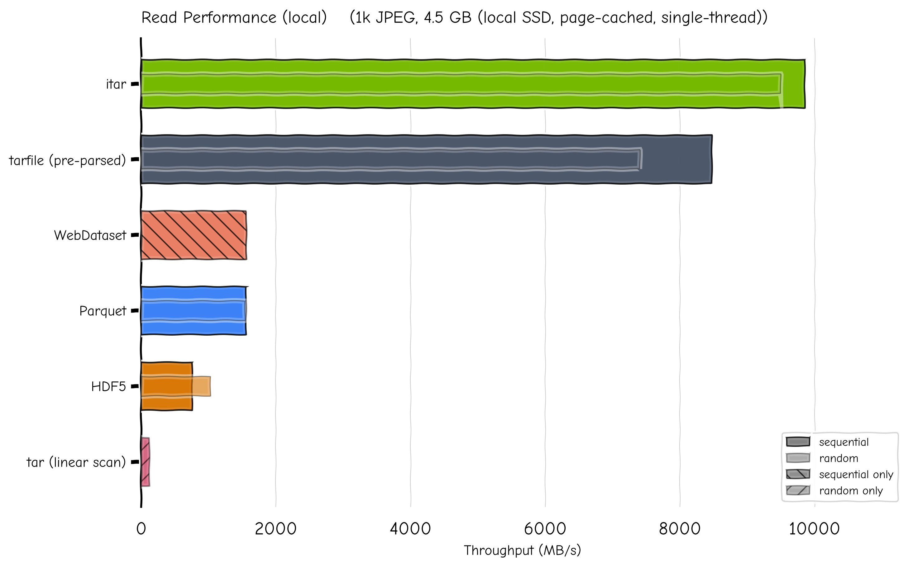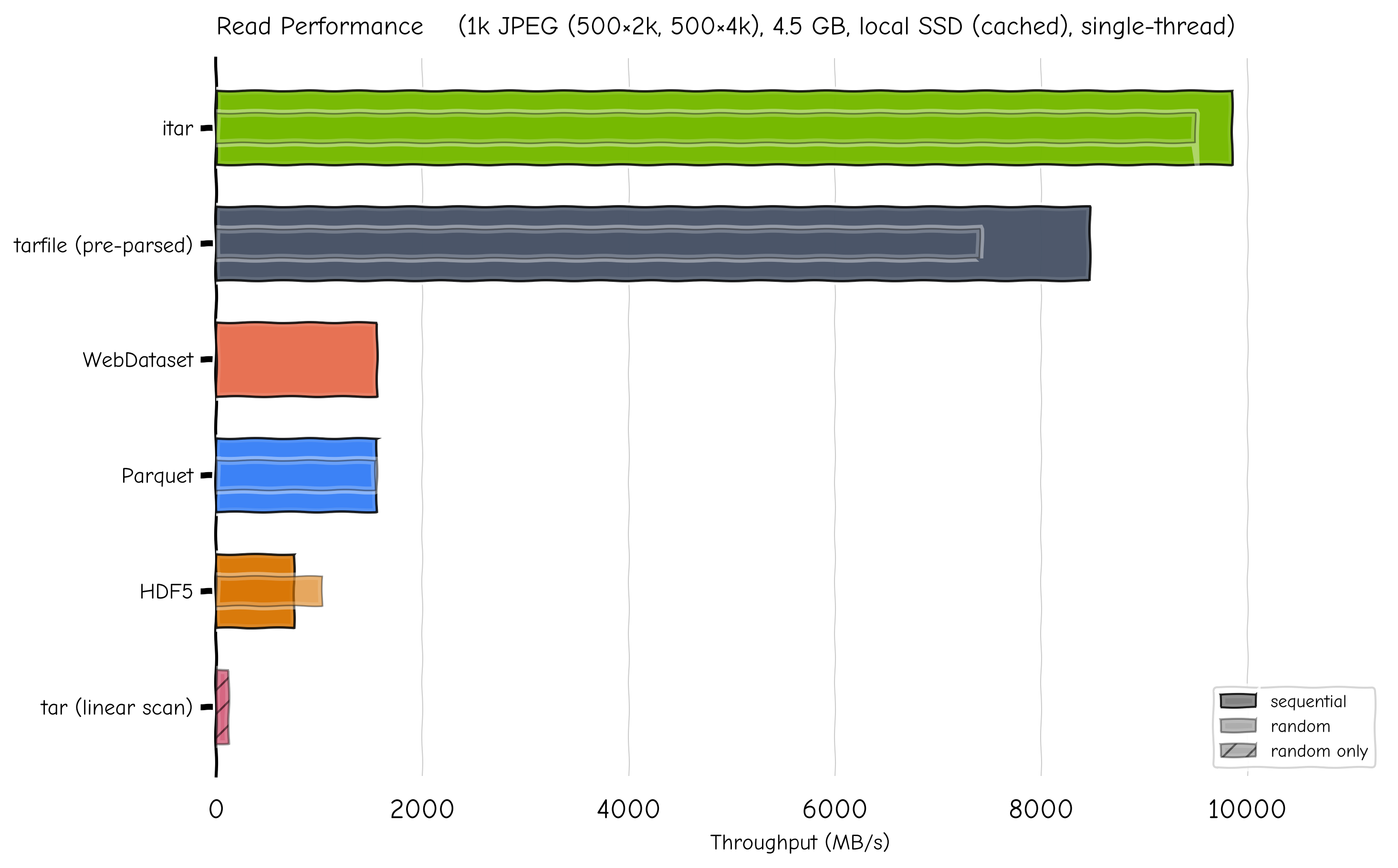 28% faster random. The gap comes from tarfile’s extractfile() wrapping