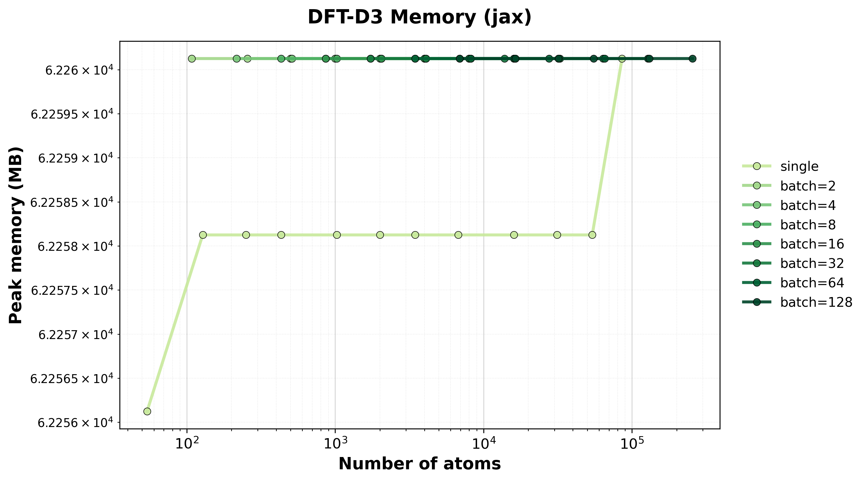 Memory : Peak GPU memory usage (MB) vs. system size. This is particularly useful for estimating/gauging memory requirements for your system.