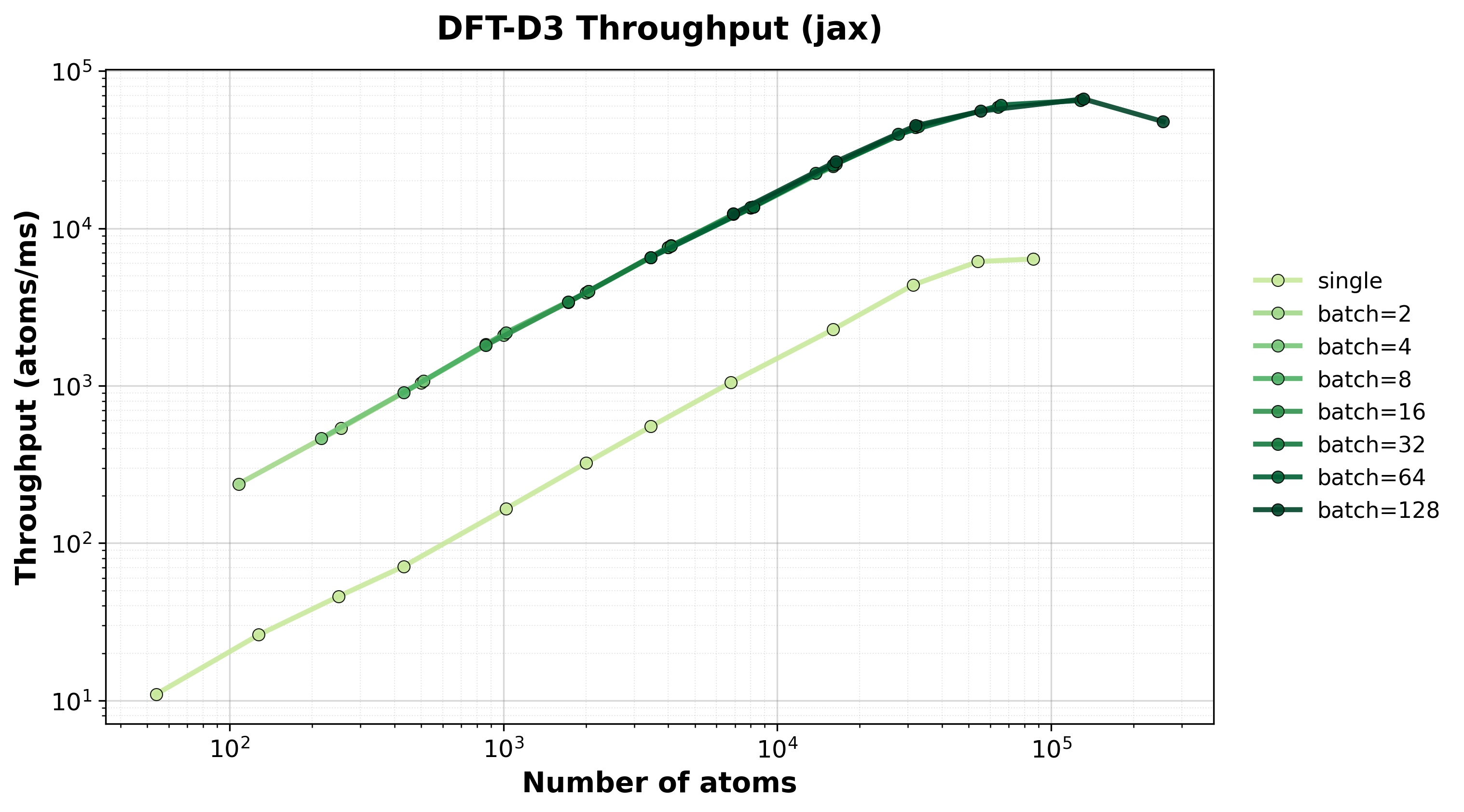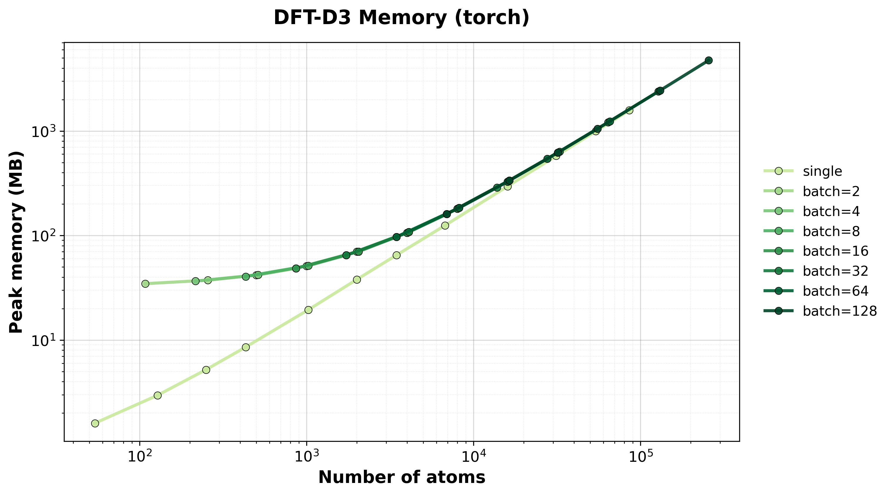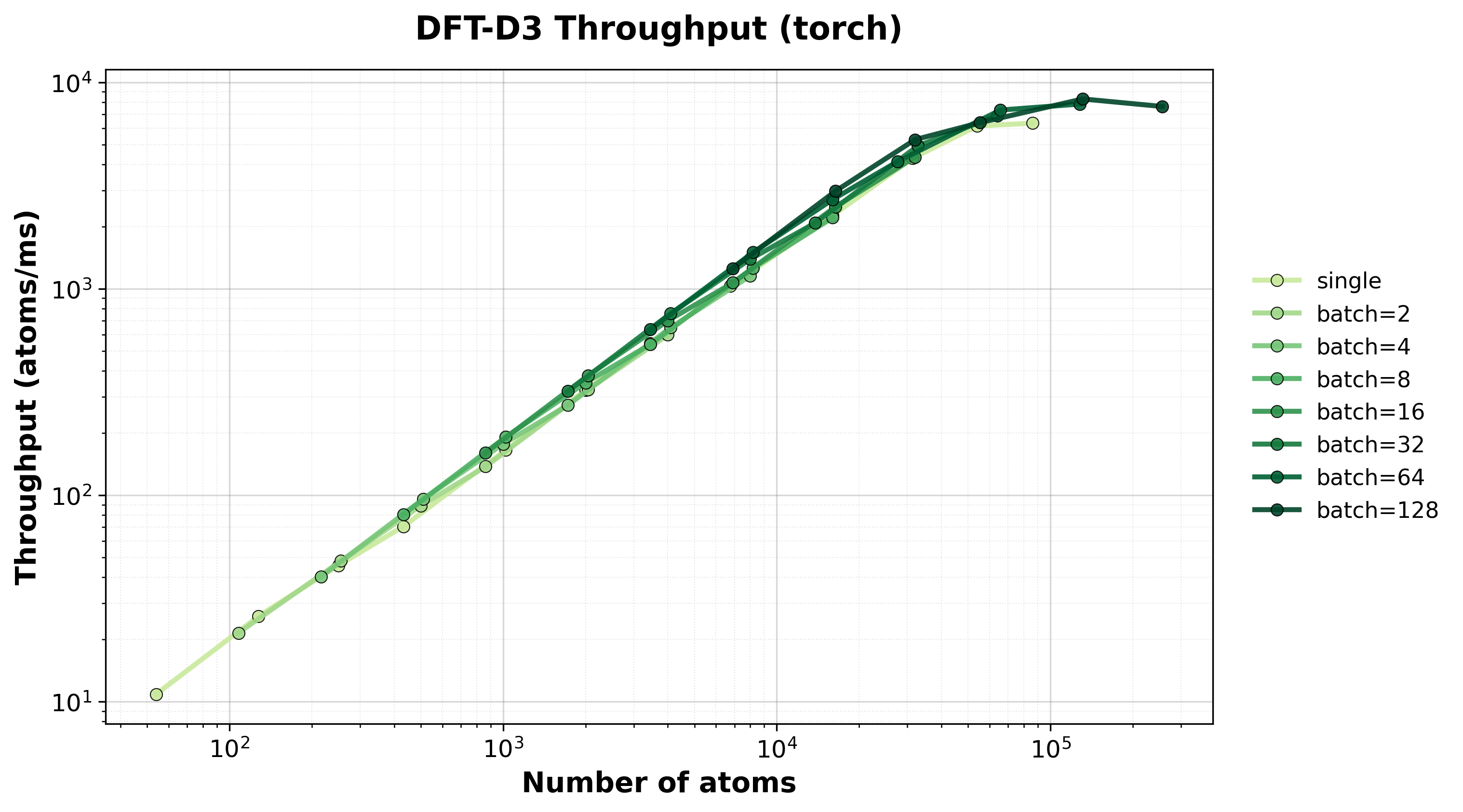This page presents benchmark results for DFT-D3 dispersion corrections across different GPU hardware. Results show the scaling behavior with increasing system size for periodic systems, including both single-system and batched computations.