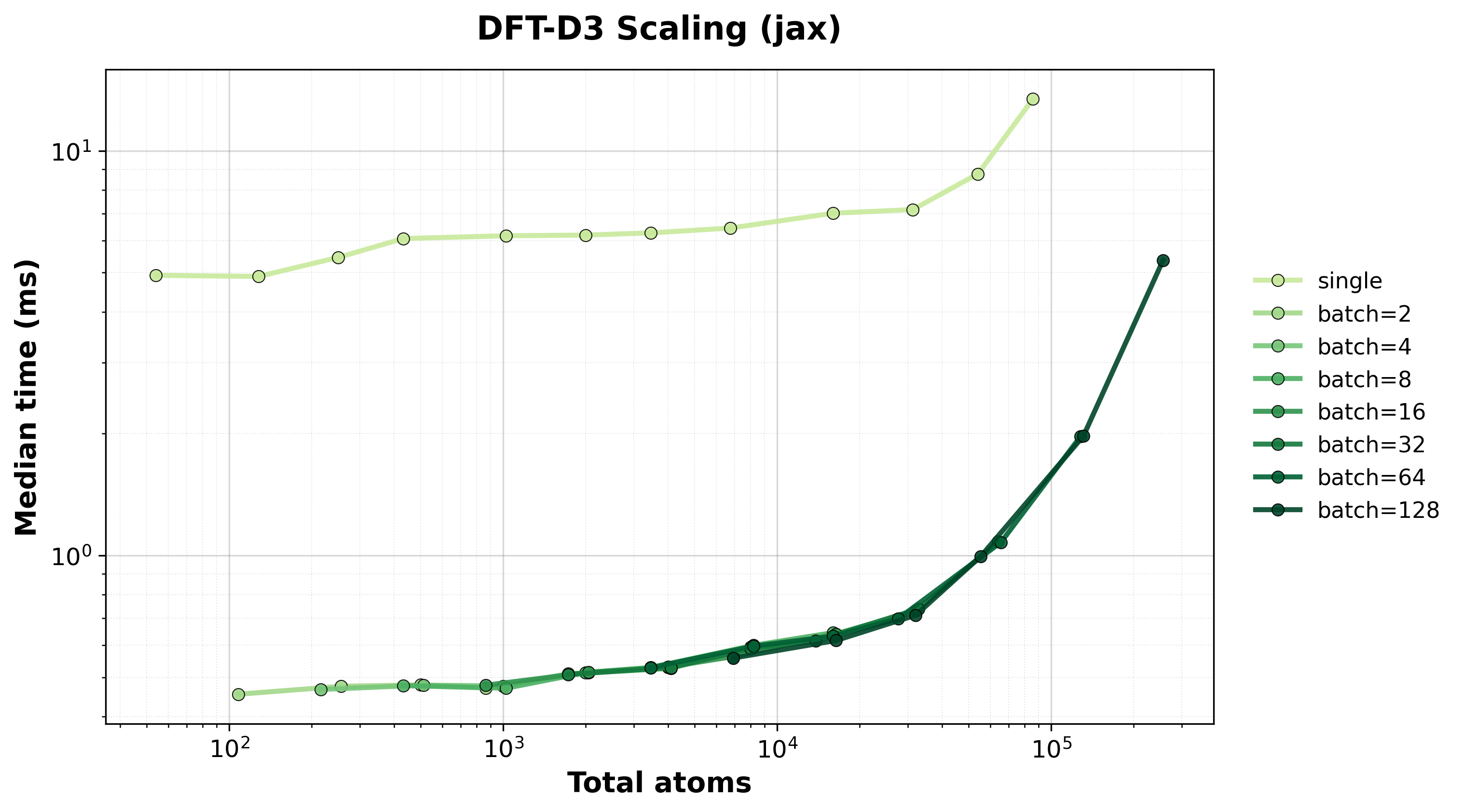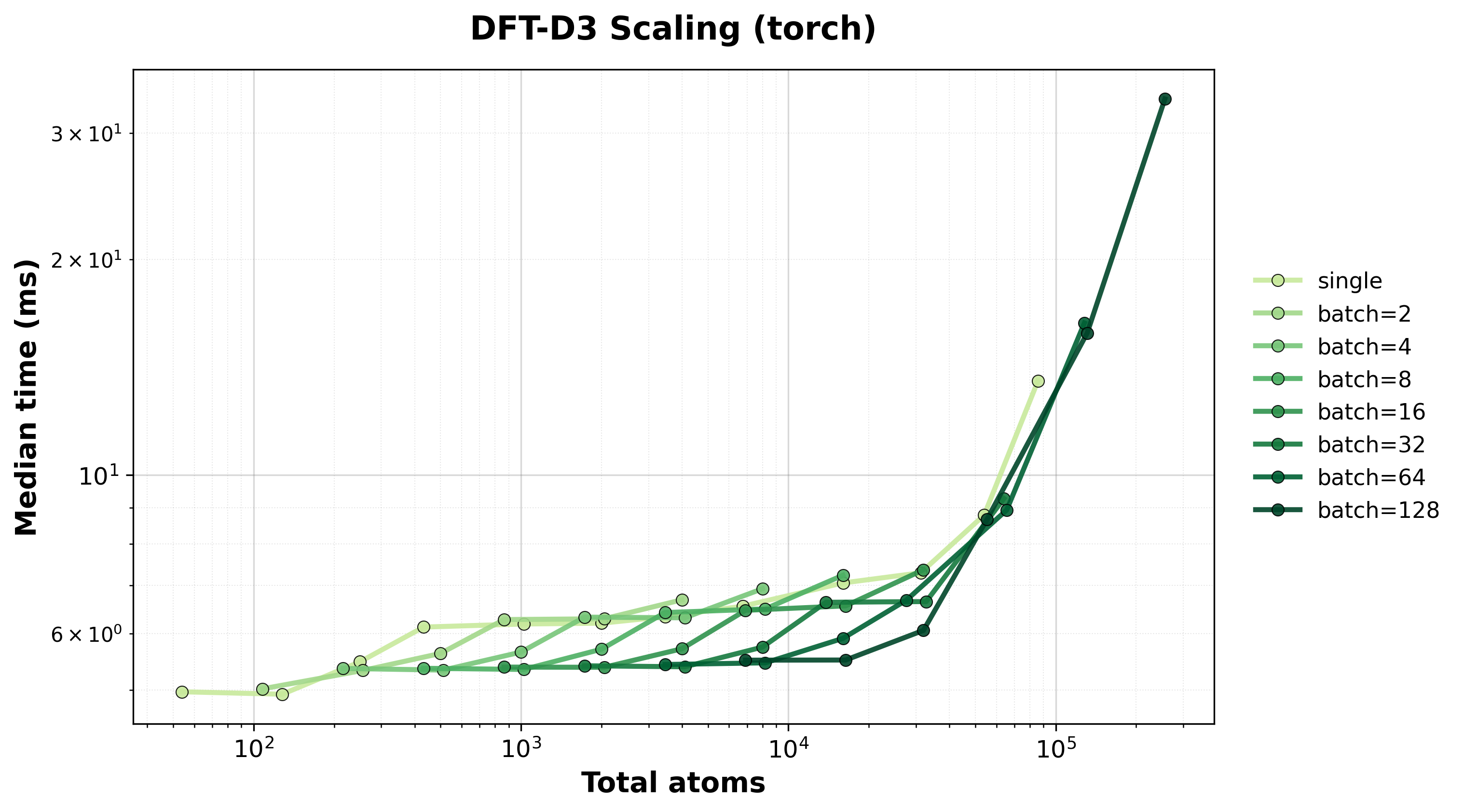 Time Scaling : Median execution time (ms) vs. system size. Lower is better. Timings exclude neighbor list construction, and only comprises the DFT-D3 computation.